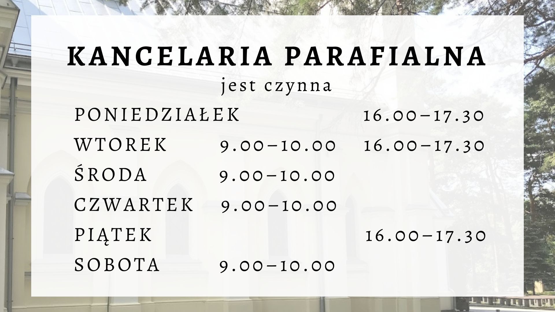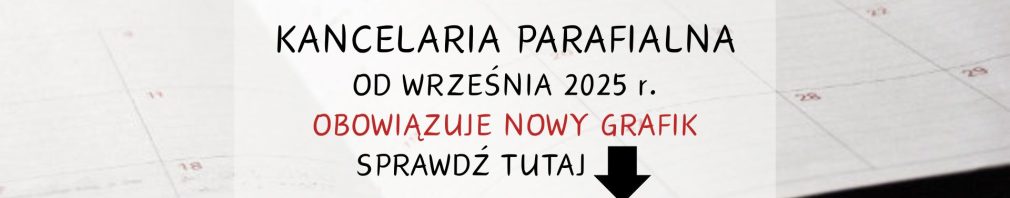 Drodzy Parafianie, ze względu na obecną sytuację personalną parafii, wprowadzamy nowy grafik kancelarii. Mamy nadzieję, że ułatwi on załatwianie spraw kancelaryjnych. Prosimy o życzliwe zrozumienie.